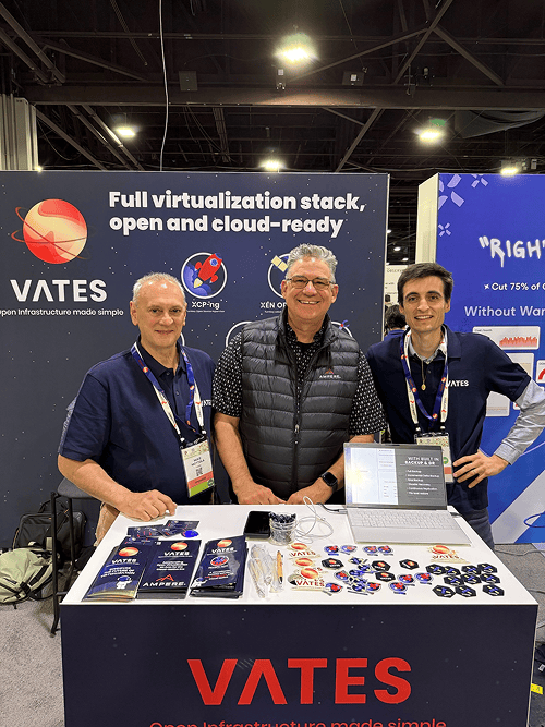 As a founder of the company, this is the kind of announcement I dreamed to do a while ago. And this year, for our first participation at KubeCon USA, we wanted to finally present it. On our booth, we showcased a working demonstration of XCP-ng and the Vates Virtualization Management Stack (VMS) running on an System76 Thelio Astra with an Ampere platform. This confirmed that XCP-ng can operate on modern ARM based infrastructure while also introducing the foundations of the upcoming XCP-ng 9.0, partially built on AlmaLinux.