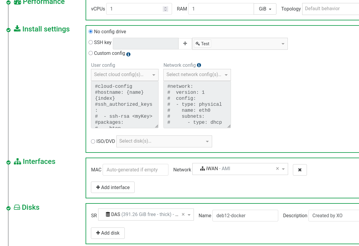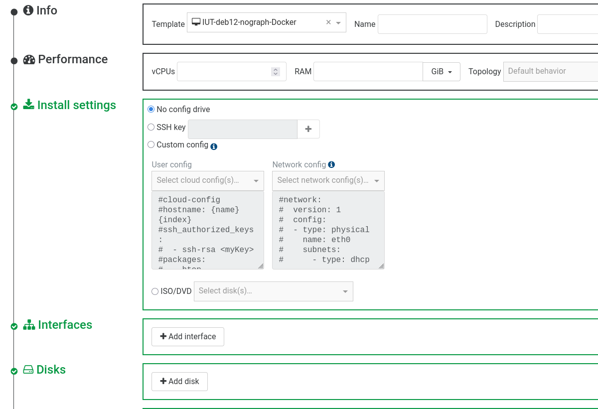 But, as you can see, Interface and Disk are "OK" (in green). If i add an Interface and no disk, the VM is created as expected with template disk, If I add a disk, it's added as a second disk.