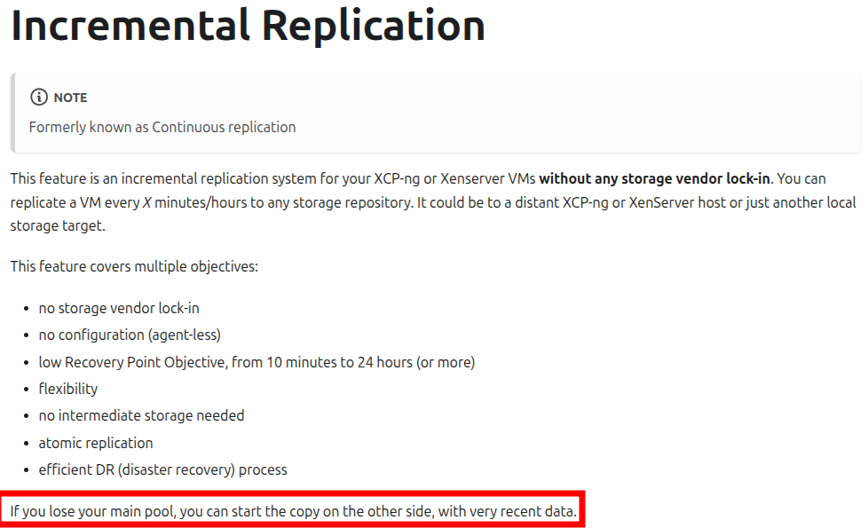 While CR is not a traditional backup it does allow for a quick restart of a damaged or lost VM. As my CR host is on-site it can share the same network and I can just start a VM immediately and then copy it back to the main pool. The CR also acts a secondary pool where some import redundant VMs run (ie DNS, another XO, etc). These secondary VMs are CR backed up to the main pool. If the main pool were to totally fail then VMs could be started on the CR host (with restricted resources).