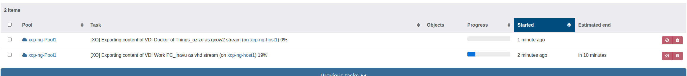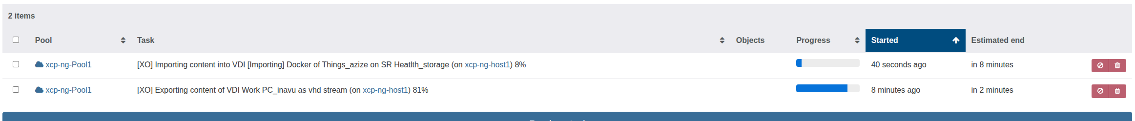 I think the import is showing progress for the vm (docker of things) because the the target storage is not qcow2 enabled (yet) its reconverting it on the fly. -[XO] Importing content into VDI [Importing] Docker of Things